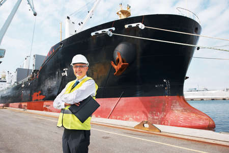 The handsome young unshaven successful business man in gray suit and protective construction orange helmet holding case, standing in sea port against a cargo rusty ship with water line background