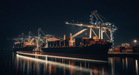 Large container ships docked at a bustling industrial port at night, illuminated by bright lights from cranes, with long exposure light trails on the water reflecting the vibrant activity of global trade and logistics.