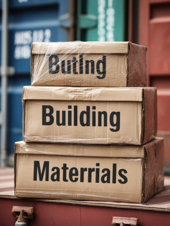 Cardboard boxes marked Building Materials are organized in a shipping container, highlighting cleanliness and orderliness at a construction area