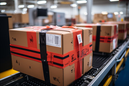 Close up image of shipping labels on packages, representing logistics, delivery, and transportation.