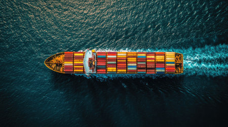 An aerial view presents a cargo ship navigating ocean waters. The vessel is laden with numerous shipping containers in vibrant hues. The composition features the ship's wake. This image could be used in various commercial applications involving shipping, logistics, and global trade.