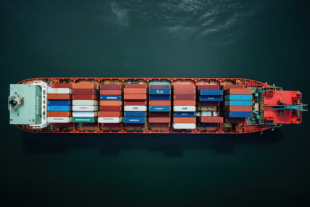 Container cargo ship, bulk transport of sea containers. Top down aerial of a commercial global transport shipping industry vessel on open water. Supply chain logistics freight carrier. import export.