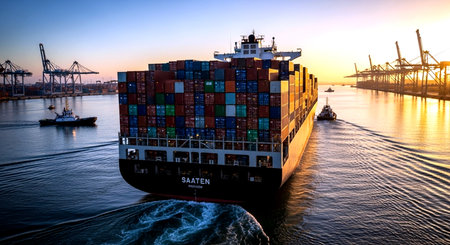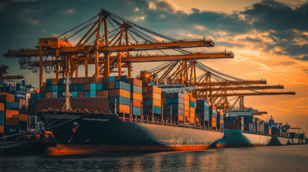 A large container ship is docked at a bustling port during sunset, with towering cranes ready for cargo operations. The scene captures the essence of maritime logistics and trade.