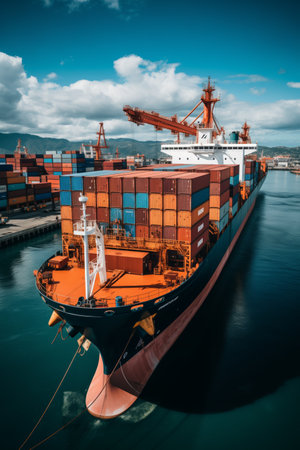A large container ship rests at the dock amidst colorful cargo containers and cranes, under a stunning sky. The scene captures the essence of maritime logistics.