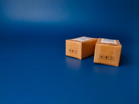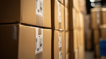 Cardboard boxes with shipping labels are stacked and awaiting shipment and delivery