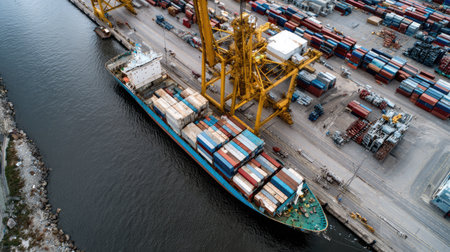 This aerial image showcases a cargo ship being loaded with colorful containers at a busy industrial port, highlighting the logistics and transportation industry.