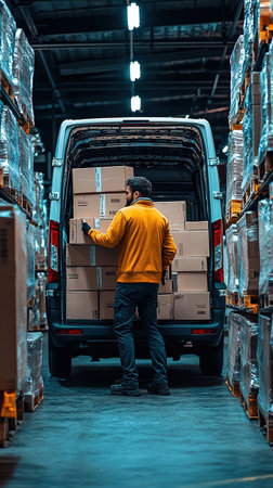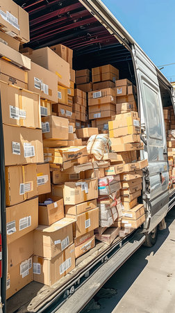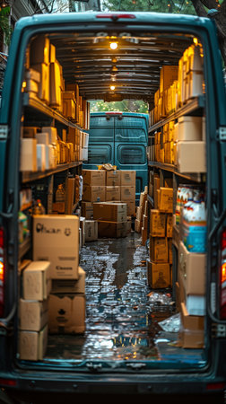 In the van's rear view, numerous cardboard boxes fill the space, suggesting a busy delivery