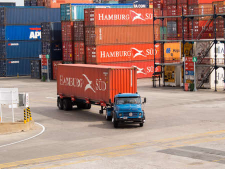 Santos, Brazil, 11, April 2013: A Hamburg Süd Container on the delivery truck at container terminal in port of Santos.