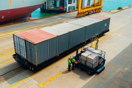 Workers engage in efficient cargo loading and unloading at a bustling port, with large shipping containers and machinery in the backdrop, capturing the essence of maritime logistics workflow.