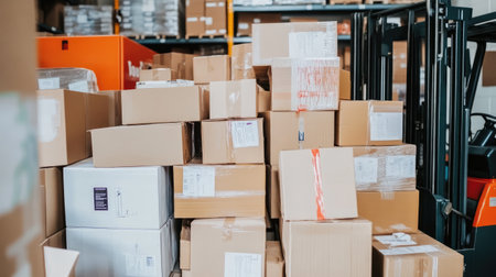 A collection of packed boxes stacked in a warehouse, showcasing the busy environment of logistics and storage operations. Ideal for business and shipping themes.