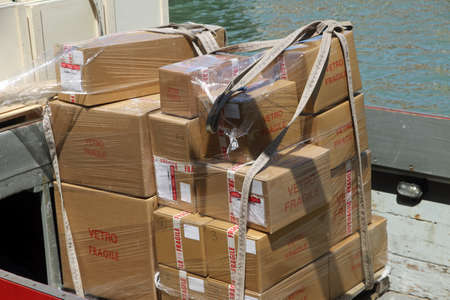 boxes for transporting precious Murano glass chandeliers made in Italy and loaded on to a boat
