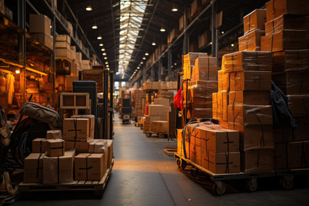 Packed courier on production line against cardboard boxes in warehouse Generative AI