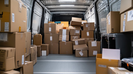 In the van's rear view, numerous cardboard boxes fill the space, suggesting a busy delivery