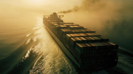 Stunning aerial shot captures a cargo ship navigating through misty ocean waters, illustrating the beauty and power of maritime transportation at sunrise.