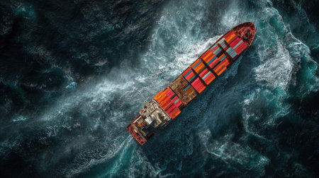 An aerial perspective shows a cargo ship amidst churning ocean waves. The vessel, filled with containers, appears to move through dark, turbulent water. The image features a top-down view with cool color tones and dynamic composition, suitable for illustrating commerce or environmental themes. It could be used for various commercial or editorial applications.