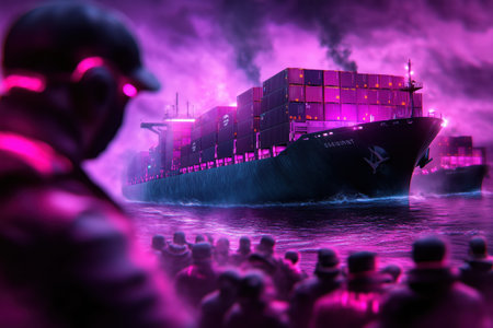 A diverse crowd gathers under a lively atmosphere at a logistics event, surrounded by large ships and cargo containers. This vibrant scene symbolizes the global essence of trade and logistics.