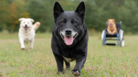 Three joyful dogs run together in a vibrant green field, showcasing happiness and companionship, one dog utilizing a wheelchair for mobility support.