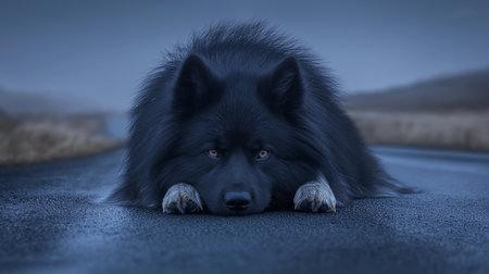 Black spitz dog lying on the road. 3D rendering.