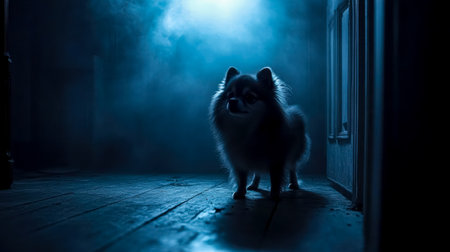 Small dog standing on wooden floor in dark room with blue light