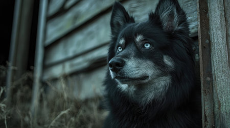 Beautiful black wolfdog with blue eyes staring at something in the distance