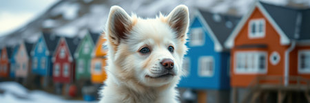 Fluffy dog posing in front of colorful houses in a snowy village during winter