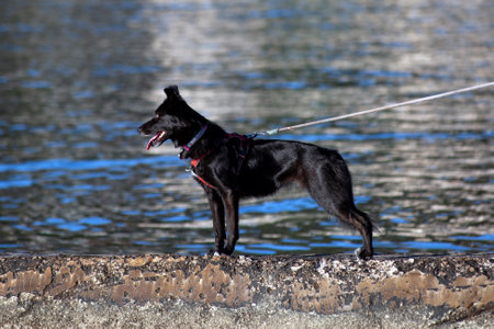 Black dog on a leash standing on the edge of the water.