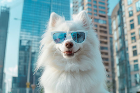 A fluffy white dog, proudly sporting trendy sunglasses, relaxes against a vibrant urban backdrop filled with towering buildings. The sunny day adds a cheerful vibe to the scene.