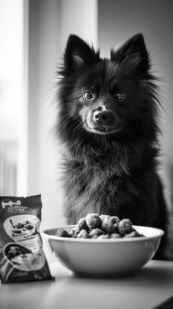 A charming black fluffy dog sits attentively near a bowl filled with small round snacks, glancing eagerly towards the treats. Sunlight softly illuminates the cozy space.