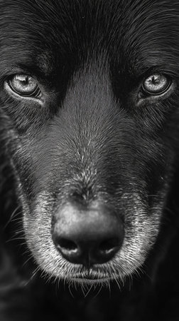 A striking black and white close up portrait of a dogs face showcasing its intense gaze and intricate fur details conveying emotion and depth.