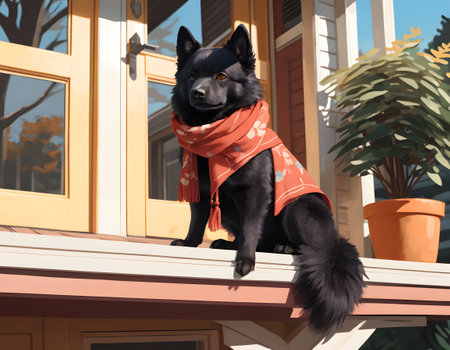 Black dog in a red scarf sits on the porch of the house.