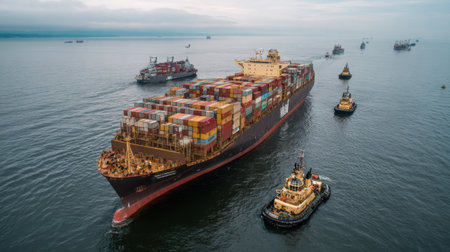A majestic container ship escorted by multiple tugboats glides through peaceful waters, emphasizing the importance of logistics and global trade in the maritime industry.