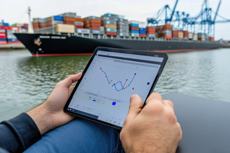 A user interacts with a tablet displaying essential data and analytics at a busy cargo port, highlighting technology's role in modern shipping and logistics operations.