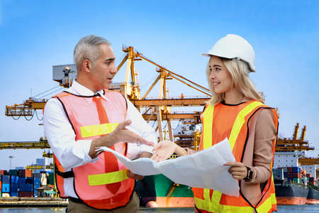 Container Shipping Logistics Engineering of Import/Export Transportation Industry, Transport Engineers Teamwork Controlling Management Containers Together at Port Ship Loading Dock. Business Team