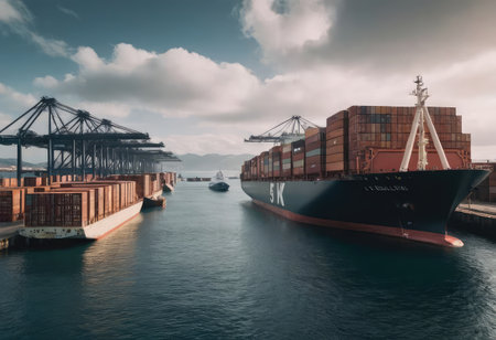 A striking image of a large container ship docked in a busy harbor, surrounded by towering cranes against a moody sky, illustrating the critical operations of maritime logistics.