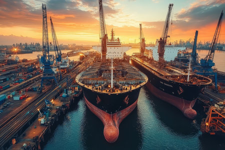 Industrial harbor scene featuring large cargo ships docked alongside cranes, with calm waterway reflecting clear blue sky, showcasing bustling activity of maritime transport and logistics