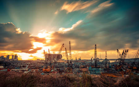 Industrial conceptual image. Dark and sullen clouds over industrial area with cranes.