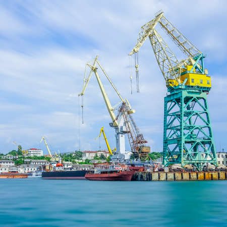 Seascape with the coastline of the port and large floating cranes. The photo was taken at a long exposure. Industrial landscape Sevastopol, Crimea.