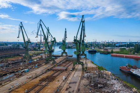 Gdansk Harbor Aerial View. Cranes at the famous shipyard of Gdansk, Pomerania, Poland.