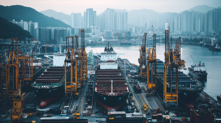 Captivating aerial perspective showcasing a bustling shipping yard filled with docked ships and towering cranes set against a stunning urban skyline, embodying maritime efficiency.