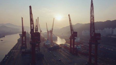 Stunning aerial view of a bustling industrial shipyard filled with cranes and docked vessels. This vibrant maritime scene showcases busy waterfront activities during golden hour.