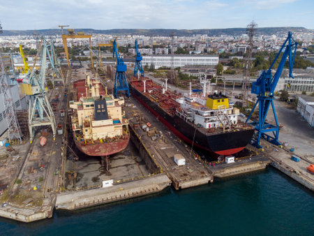 aerial view shipyard dry dock maintenance and repair cargo ship transport and oil ships in sea
