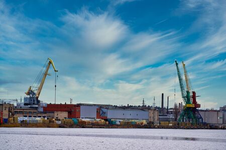 Ships cargo cranes on shore in winter
