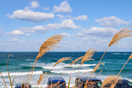 A scenic view of the ocean with gentle waves, tall grasses swaying in the wind, and a vibrant blue sky filled with fluffy clouds. Perfect nature and seasonal background.