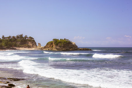 Blue sky and waves spreading on Iwaya coast in winter