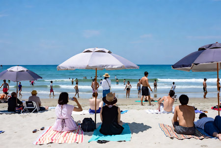 crowded beach in summer time at Kamakura, Japan