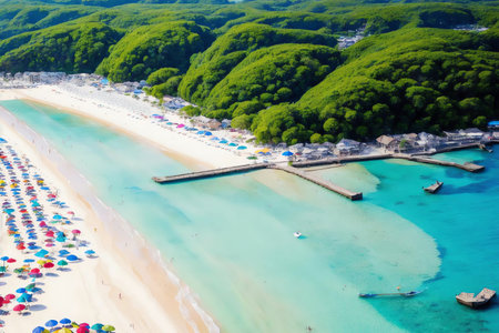 Shirarahama, Japan - October 25, 2023: A wide sandy beach with scattered people walking near the shoreline, adjacent to turquoise water, with modern buildings, hotels, and a forested area visible in the background under a clear blue sky.