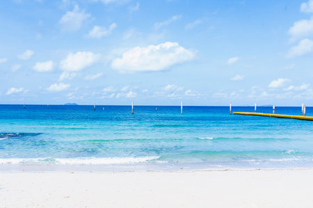 Beach and waves tropical sea with blue sky on sunny day background. copy space