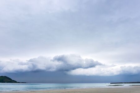 Tauranga, New Zealand - February 23 2020; White sandy beach and Leisure Island stand out brightly when caught in sun against background dark blue raincloud sky.