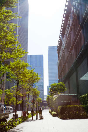 Tokyo city street Business Building with Japanese People walking riding bicycle to work Tokyo City lifestyle in Morning TOKYO, JAPAN - APR 17, 2019