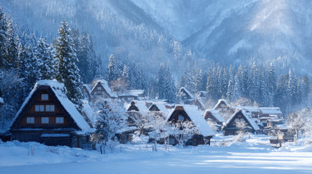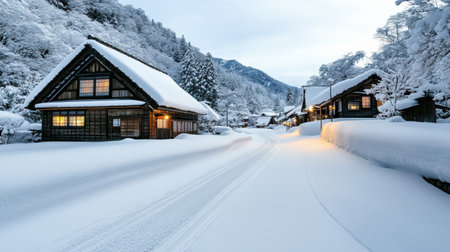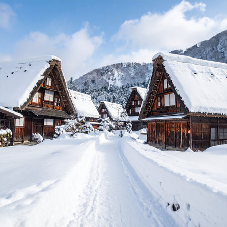 Snowy Japanese village, capturing traditional winter beauty.